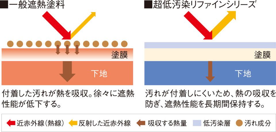 超低汚染リファインシリーズは、塗膜表面が汚れにくい超低汚染性を持つ塗料であるため、汚れによる熱の吸収を防ぎ、長期間経過しても、一般の遮熱塗料に比べ、遮熱性能を保持し続けます。